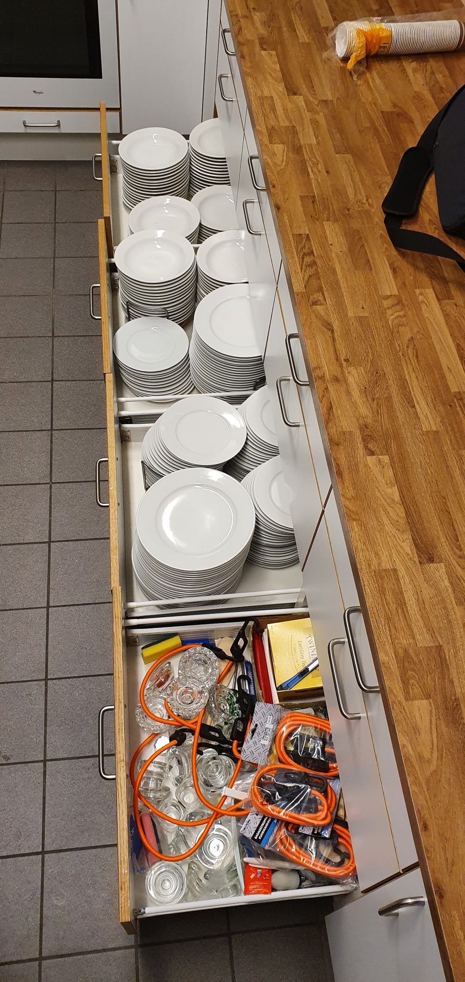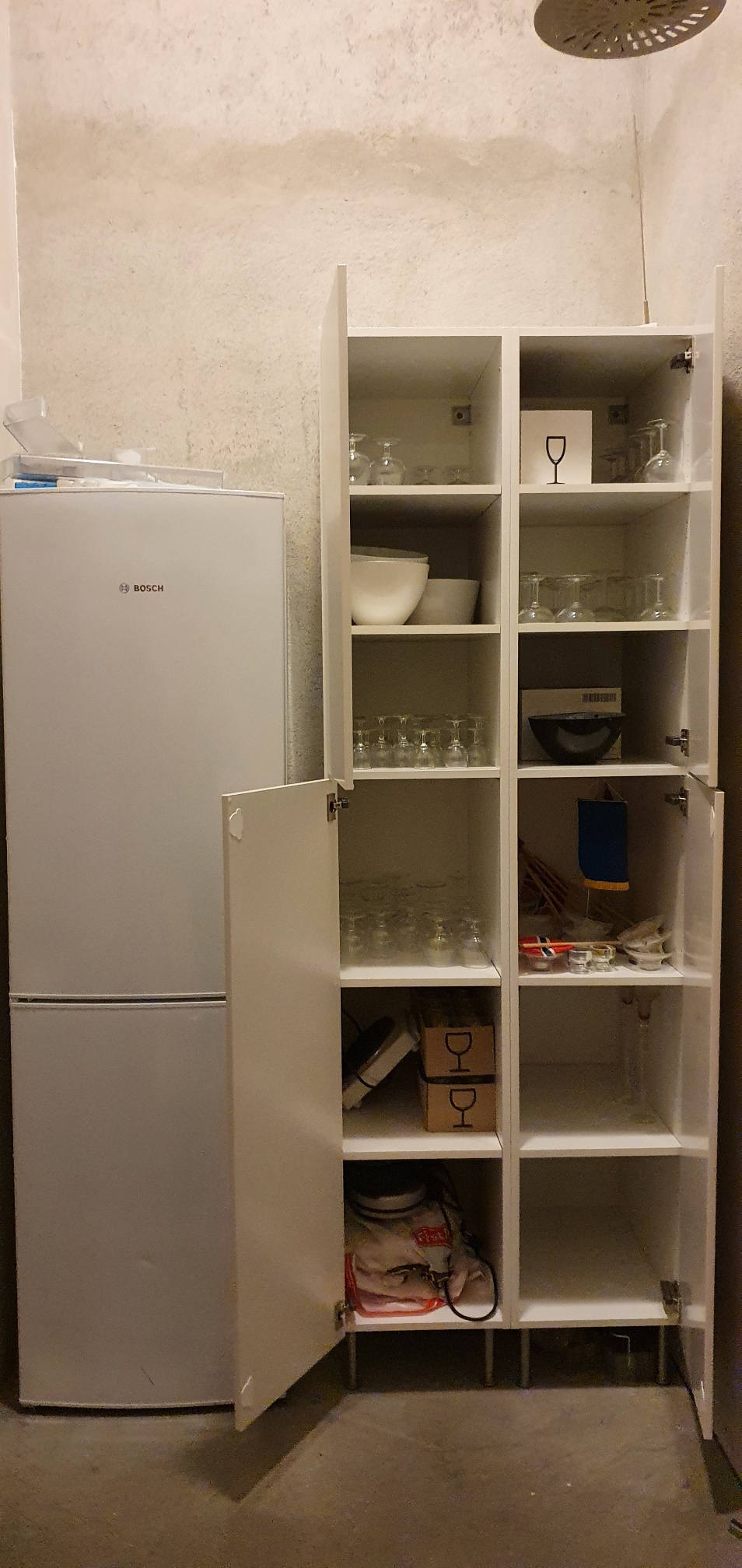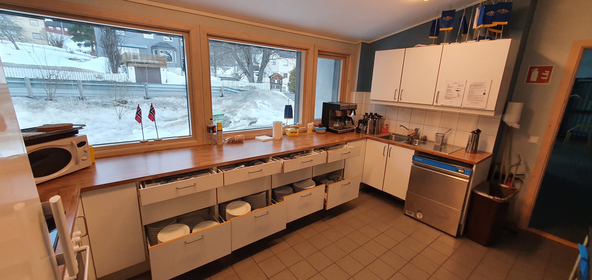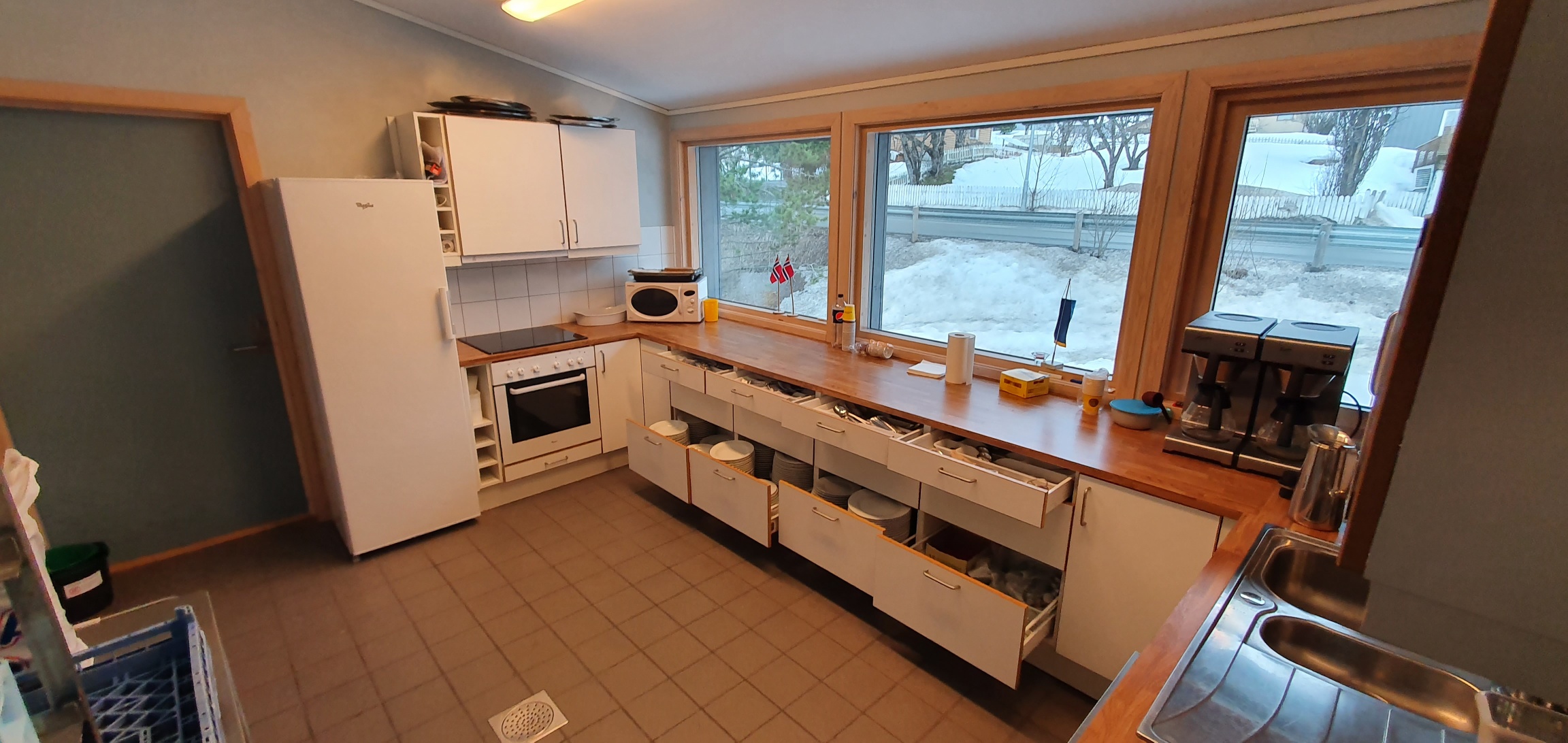 Velutstyrt kjøkken med bestikk, fat, kaffekoper, lysestaker, kaffekanner, saftmugger osv.