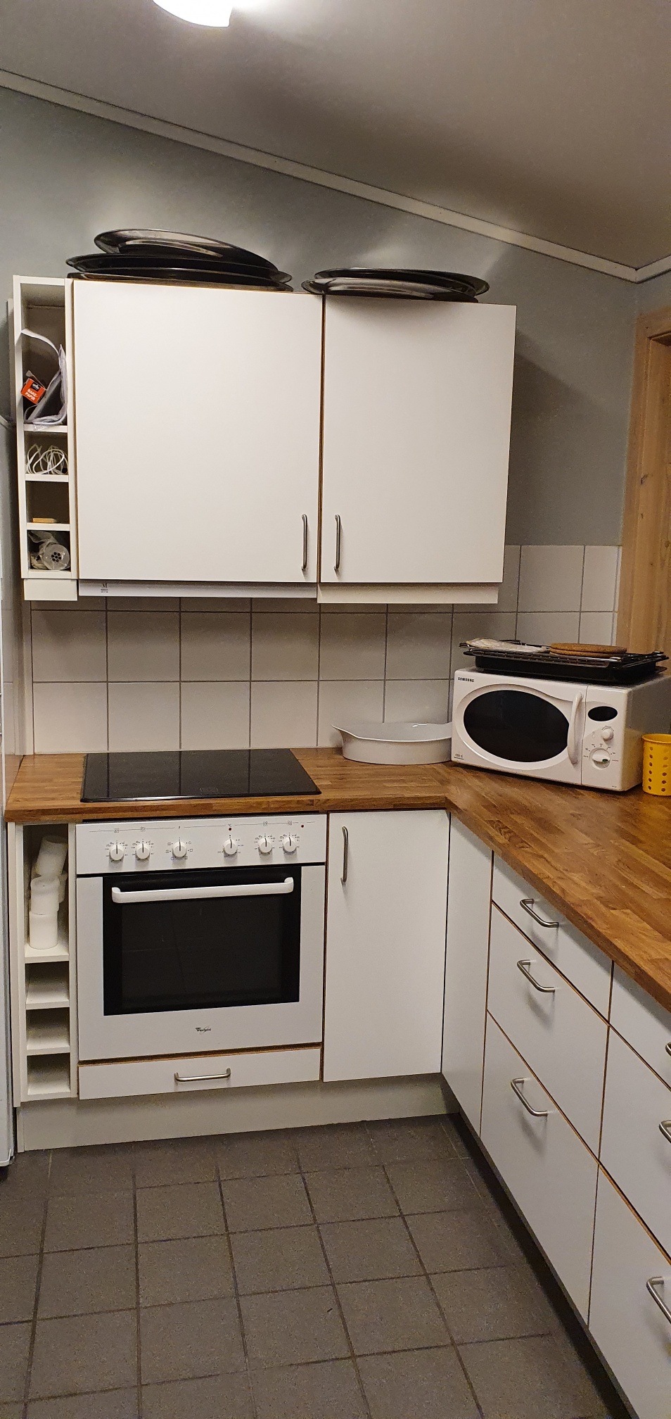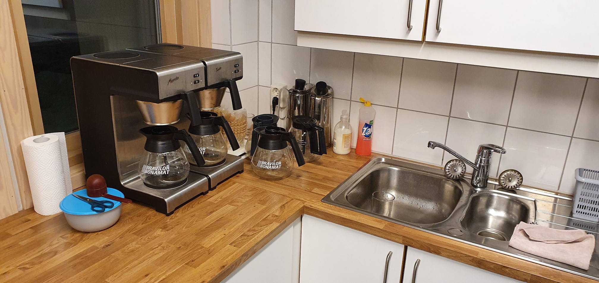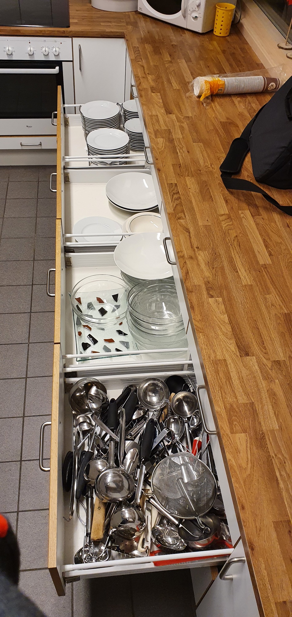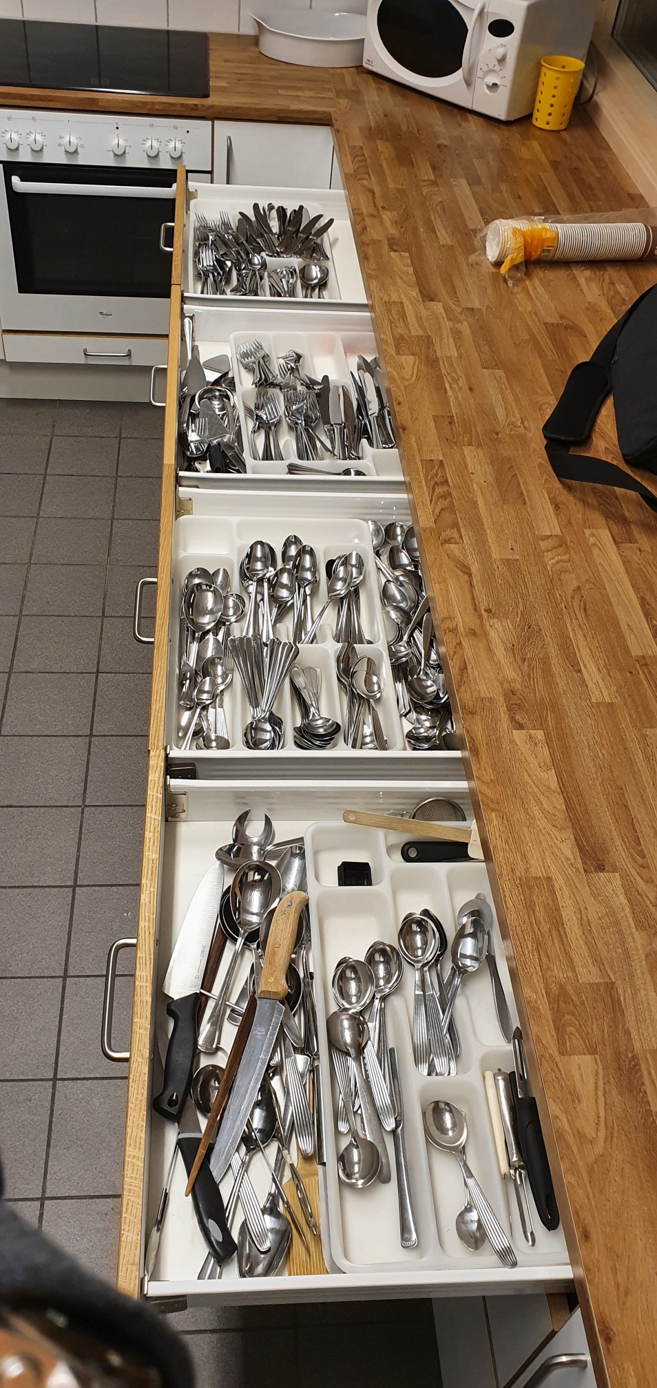 Velutstyrt kjøkken med bestikk, fat, kaffekoper, lysestaker, kaffekanner, saftmugger osv.